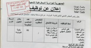 ولاية : تيبازة دائرة : فوكة بلدية : دواودة ads اعلان عن توظيف يعلن رئيس المجلس الشعبي البلدي لبلدية الدواودة ، عن فتح مسابقة توظيف للإلتحاق بالرتب المبينة أدناه: الرتبة: سائق سيارة نمط التوظيف: على أساس الإختبار المهني شروط الإلتحاق: نسخة من رخصة السياقة …