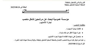 وزارة العمل والتشغيل والضمان الإجتماعي الوكالة الوطنية للتشغيل الفرع الولائي للتشغيل بالجلفة الملحقة المحلية للتشغيل بالجلفة ads إعلان الجلفة في 10/08/2025 مؤسسة عمومية تبحث عن مرشحين لشغل منصب آلة الرفع CONDUCTEUR DE GRUE MOBILE متطلبات المنصب: الإقامة ببلدية المحيارة. خبرة مهنية لاتقل عن 04 …