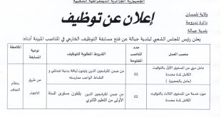 وزارة الصحة معهد التكوين شبه الطبي للنعامة ads إعــــــلان النعامة في: 25 أوت 2025 يعلن مدير معهد التكوين شبه الطبي للنعامة عن توفر المناصب التالية عن طريق التكفل بعد عملية النقل: إعلان عن توظيف بالمجلس الأعلى للشباب: الجزائر العاصمة، البليدة، تيبازة، بومرداس. إعلان توظيف …