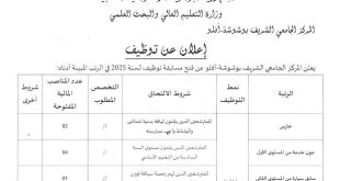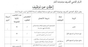 وزارة التعليم العالي والبحث العلمي المركز الجامعي الشريف بوشوشة -أفلو ads إعلان عن توظيف يعلن المركز الجامعي الشريف بوشوشة -أفلو عن فتح مسابقة توظيف لسنة 2025 على اساس الشهادات وعلى اساس الاختبار في الرتب المبينة أدناه: إعلان عن توظيف بالمجلس الأعلى للشباب: الجزائر العاصمة، …