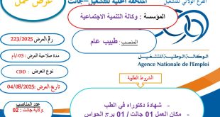 وزارة العمل، التشغيل و الضمان الاجتماعي الفرع الولائي للتشغيل جانت الملحقة المحلية للتشغيل -جانت الوكالة الوطنية للتشغيل ads عرض عمل المؤسسة: وكالة التنمية الاجتماعية المنصب: طبيب عام الشروط المطلوبة مدة صلاحية العرض: 03 أيام نوع العرض: CDD تاريخ العرض: 04/08/2025 شهادة دكتوراه في الطب …