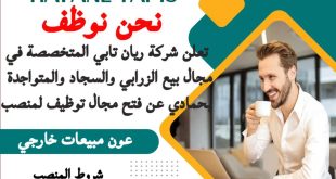 RAYANE TAPIS توظيف: ads تعلن شركة ريان تابي المتخصصة في مجال بيع الزرابي والسجاد والمتواجدة بحمادي عن فتح مجال توظيف لمنصب عون مبيعات خارجي شروط المنصب الجدية والانضباط في العمل لياقة بدنية جيدة القدرة على العمل ضمن فريق للتواصل يرجى إرسال السيرة الذاتية على …