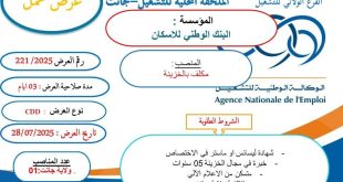 يوليو 28, 2025 أم البواقي, أولاد جلال, اخبار التوظيف, ادرار, الأغواط, البليدة, البويرة, البيض, الجزائر العاصمة, الجلفة, الشلف, الطارف, القطاع العسكري, المدية, المسيلة, المغير, المنيعة, النعامة, الوادي, اليزي, باتنة, بجاية, برج باجي مختار, برج بوعريريج, بسكرة, بشار, بني عباس, بوسعادة, بومرداس, تبسة, تقرت, تلمسان, تمنراست, تندوف, تيارت, تيبازة, تيزي وزو, تيسمسيلت, تيميمون, جانت, جيجل