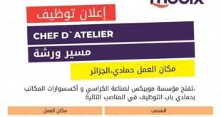 إعلان توظيف ads مسير ورشة مكان العمل حمادي، الجزائر ، تفتح مؤسسة موبيكس موبيكس لصناعة الكراسي و أكسسوارات المكاتب بحمادي باب التوظيف في المناصب التالية مكان العملالمنصبحمادي، الجزائر HAMMEDI, ALGERمسير ورشة CHEF D`ATELIER الإشراف الكامل على عمليات الخياطة و التنجيد و ضمان جودة التنفيذ …