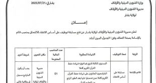 وزارة الشؤون الدينية والأوقاف مديرية الشؤون الدينية والأوقاف لولاية بشار ads بشار في: 2025/07/21 إعلان تعلن مديرية الشؤون الدينية والأوقاف لولاية بشار عن فتح مسابقة توظيف على أساس الانتقاء للالتحاق بمنصب قائم بالإمامة بصفة متعاقد وفقاً للجدول المبين أدناه: الرتبةنمط التوظيفالشهادة المطلوبةمكان التعيينشروط أخرىعدد …