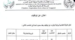 وزارة الفلاحة والتنمية الريفية والصيد البحري الغرفة الفلاحية لولاية تقرت ads اعلان عن توظيف تعلن الغرفة الفلاحية بولاية تقرت عن توظيف بعقد محدود المدة في المنصب التالي: الرقممنصب الشغلعدد المناصبنمط التوظيفشروط المشاركةمكان العمل01حارس ليلي01على أساس الانتقاءاللياقة البدنية التي تتماشى و النشاط الواجب ممارستهمقر الغرفة …