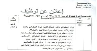 ولاية سعيدة مديرية الإدارة المحلية ads إعلان عن توظيف تعلن مديرية الإدارة المحلية لولاية سعيدة عن فتح مسابقة على أساس الشهادة للالتحاق برتبة كاتب: الرتبةعدد المناصب المفتوحةشروط المشاركةمكان التعيين (الولاية أو الدوائر)كاتب01شهادة التحكم المهني أو المهنة في الكتابة. شهادة التحكم المهني أو المهنة في …