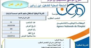 وزارة العمل و التشغيل و الضمان الإجتماعي الوكالة الوطنية للتشغيل الملحقة المحلية للتشغيل: سوق أهراس الفرع الولائي للتشغيل: سوق أهراس ads عرض عمل شركة الوطنية للأشغال العمومية Société Nationale de Travaux Publics تاريخ تسجيل العرض: 21/07/2025 قطاع المؤسسة: عام عدد المناصب: 04 المهنة المطلوبة: …