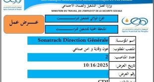 وزارة العمل والتشغيل والضمان الا=جتماعي الوكالة الوطنية للتشغيل ads عرض عمل شركة سوناطراك تعلن عن عروض عمل على مستوى مختلف الملاحق المحلية للتشغيل كالتالي: الولايات المعنية: توقرت إيليزي جانت إعلان عن توظيف بالمجلس الأعلى للشباب: الجزائر العاصمة، البليدة، تيبازة، بومرداس. إعلان توظيف في مديرية …