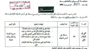 وزارة الصحـة ولاية خنشلة مديرية الصحـة والسـكـان ads إعــــــلان تعلن مديرية الصحة والسكان لولاية خنشلة عن فتح مسابقة على أساس الشهادة للإلتحاق بسلك المحاسبين رتبة: محاسب إداري بعنوان سنة 2025. الرتبـةعدد المناصب الماليـة المفتوحةنمط التوظيفالمؤهلات المطـلوبةمكان التعيينتقني في الإعلام الآلـي01مسابقة على أساس الشهادة– شهادة …
