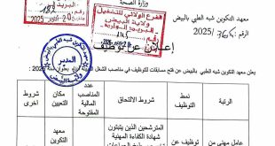 وزارة العمل والتشغيل والضمان الاجتماعي الوكالة الوطنية للتشغيل الفرع الولائي للتشغيل: الشلف الملحقة المحلية للتشغيل: تنس ads عرض عمل الهيئة المستخدمة: الديوان الوطني للتطهير ONA تاريخ التسجيل: 20/10/2025 المنصب المطلوب: حارس مضخة شبكة الصرف الصحي مكان العمل: المرسى – القلتة نوع العقد: CDI الشهادة …