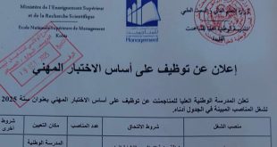 وزارة التعليم العالي و البحث العلمي المدرسة الوطنية العليا للمناجمنت ads إعلان عن توظيف على أساس الاختبار المهني تعلن المدرسة الوطنية العليا للمناجمنت عن توظيف على أساس الاختبار المهني بعنوان سنة 2025 لشغل المناصب المبينة في الجدول أدناه: منصب الشغلشروط الالتحاقعدد المناصبمكان التعيينشروط أخرىحارسلياقة …