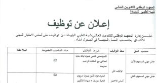 وزارة الصحة المعهد الوطني للتكوين العالي شبه الطبي للبليدة ads إعلان عن توظيف تعلن إدارة المعهد الوطني للتكوين العالي شبه الطبي للبليدة عن توظيف على أساس الاختبار المهني للالتحاق بمناصب الشغل المبينة في الجدول أدناه. المنصب عملنمط التوظيفشروط التوظيفعدد المناصب المفتوحةالملاحظةعامل مهني المستوى الأولتوظيف …