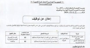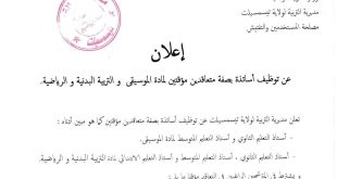 وزارة التربية الوطنية مديرية التربية لولاية تيبسسيلت مصلحة المستخدمين والتفتيش ads إعلان عن توظيف أساتذة بصفة متعاقدين مؤقتين لمادة الموسيقى و التربية البدنية والرياضية. تعلن مديرية التربية لولاية تبسسيلت عن توظيف أساتذة بصفة متعاقدين مؤقتين كما هو مبين أدناه: أستاذ التعليم الثانوي و أستاذ …
