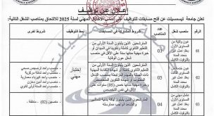 وزارة التعليم العالي والبحث العلمي جامعة تيسمسيلت ads إعــلان عـن تـوظيـف تعلن جامعة تيسمسيلت عن فتح مسابقات للتوظيف على أساس الإختبار المهني لسنة 2025 للإلتحاق بمناصب الشغل التالية: الرقممنصب شغلعدد المناصبشروط المشاركة في المسابقاتنمط التوظيفشروط أخرى01عون وقاية من المستوى الأول01المترشحون الذين يثبتون مستوى السنة …