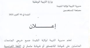 وزارة التربية الوطنية مديرية التربية لولاية البليدة مصلحة المستخدمين ads إعــــــلان تعلم مديرية التربية لولاية البليدة جميع خريجي الجامعات الحاصلين على شهادة الماجستير أو شهادة ماستر في اللغة الفرنسية الراغبين في التوظيف عن طريق التعاقد على مناصب شاغرة في الطور الثانوي كأستاذ لمادة اللغة …