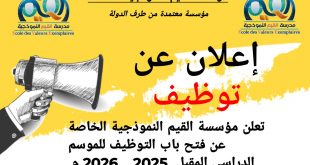 إعلان عن توظيف مؤسسة القيم النموذجية الخاصة مؤسسة معتمدة من طرف الدولة ads تعلن مؤسسة القيم النموذجية الخاصة عن فتح باب التوظيف للموسم الدراسي المقبل 2025 – 2026 م. الطور المتوسط أستاذ(ة) الاجتماعيات. أستاذ(ة) الرياضيات. أستاذ(ة) اللغة الإنجليزية. أستاذ(ة) الفيزياء. أستاذ(ة) اللغة الفرنسية. الطور …