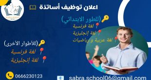 SabraSchool ads اعلان توظيف: تعلمكم مدرستنا Sabraschool للتعليم و للتكوين في اللغات الأجنبية أنها تبحث عن توظيف أساتذة و ذلك كالتالي : للطور الابتدائي: أستاذ (ة) متمرس(ة) في لغات المحادثة الفرنسية الإنجليزية أستاذ (ة) متمرس (ة) في مادتي الرياضيات و اللغة العربية للأطوار الأخرى: …