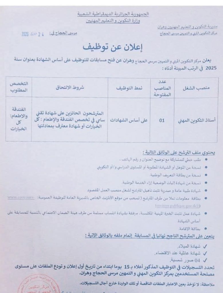 يعلن مركز التكوين المهني والتمهين مرسى الحجاج وهران عن فتح مسابقات للتوظيف على أساس الشهادة بعنوان سنة 2025 في الرتب المبينة أدناه:
