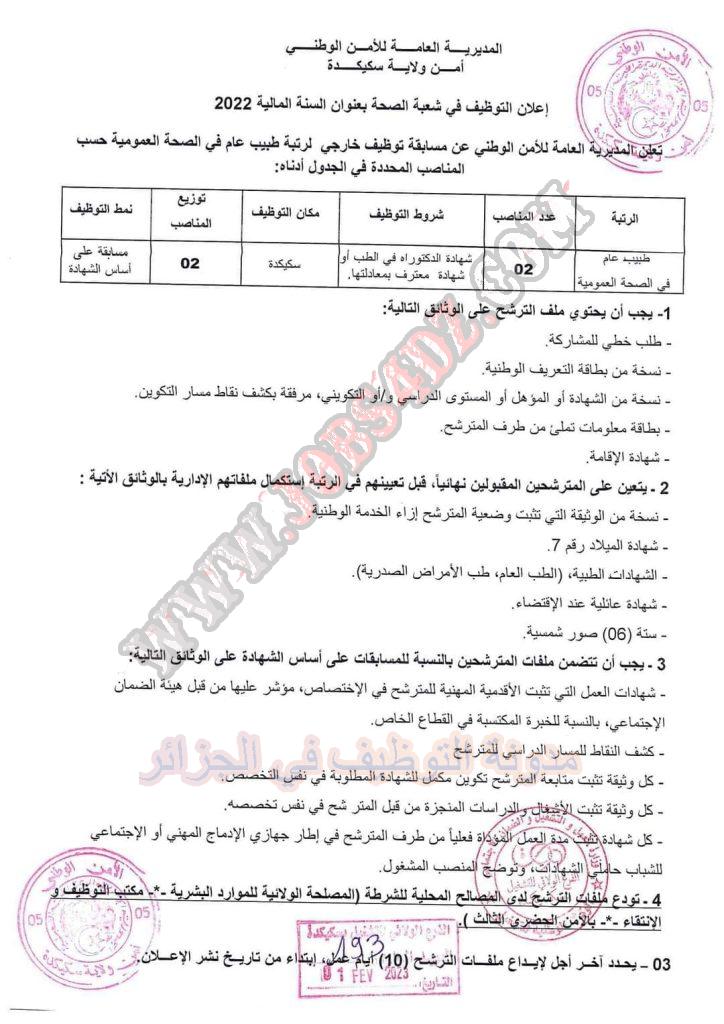 تعلن المديرية العامة للامن الوطني سكيكدة عن فتح مسابقة توظيف على اساس الشهادة في الرتب المبينة ادناه