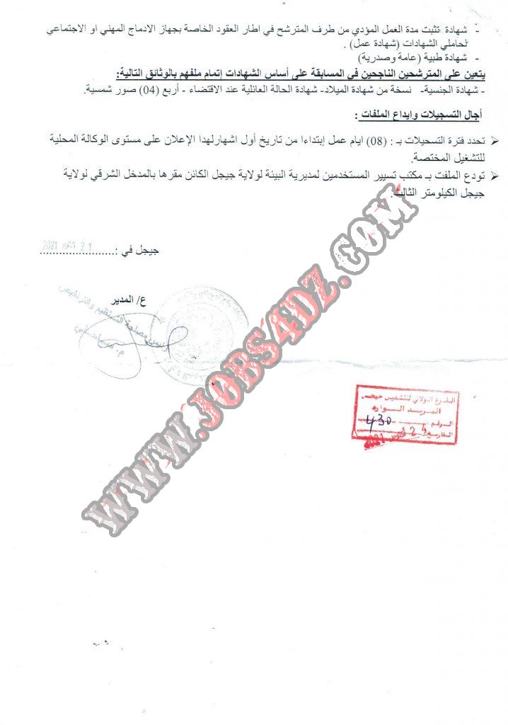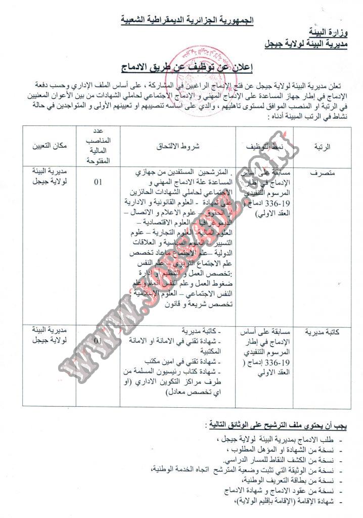تعلن مديرية البيئة لولاية جيجل عن فتح مسابقة توظيف خاصة بالمشتغلين في اطار جهازي المساعدة على الادماج المهني والادماج الاجتماعي لحاملي الشهادات في مناصب الشغل التالية