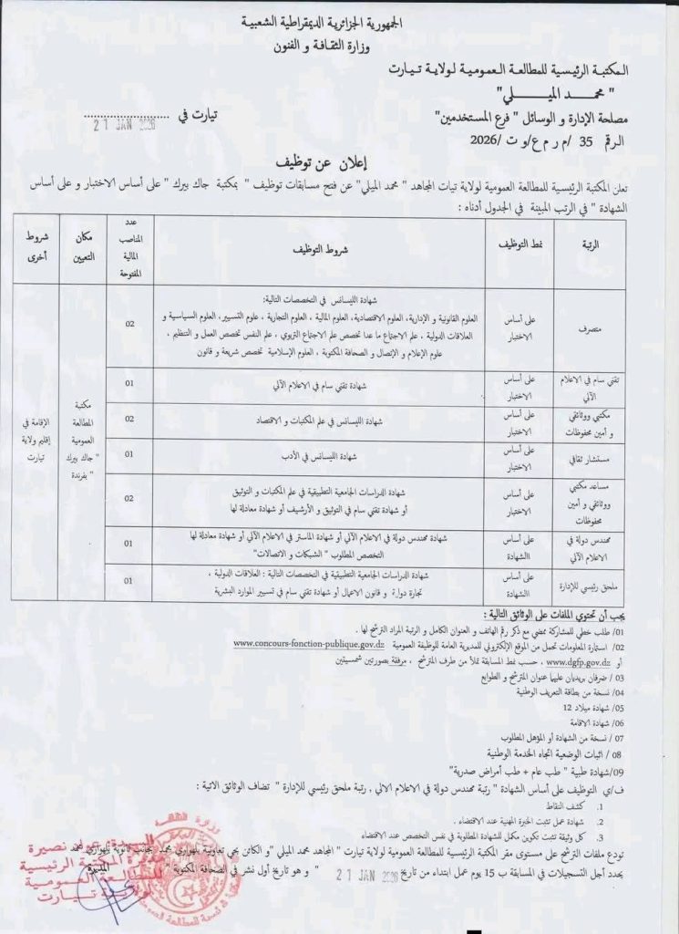 تعلن المكتبة الرئيسية للمطالعة العمومية لولاية تيارت “المجاهد محمد الميلي” عن فتح مسابقات توظيف بمكتبة “جاك بيرك” بفرندة على أساس الاختبار وعلى أساس الشهادة في الرتب المبينة في الجدول أدناه: