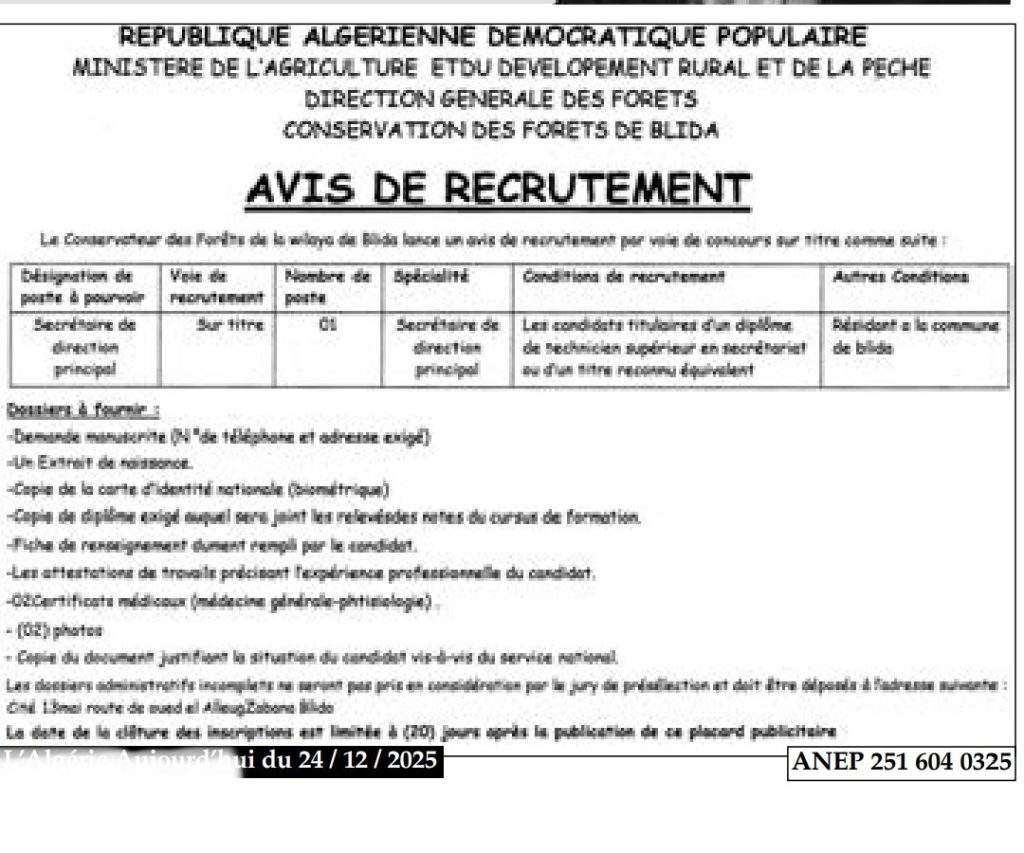 يعلن محافظ الغابات لولاية البليدة عن فتح مسابقة للتوظيف عن طريق الاختبار المهني في الرتبة المبينة أدناه: