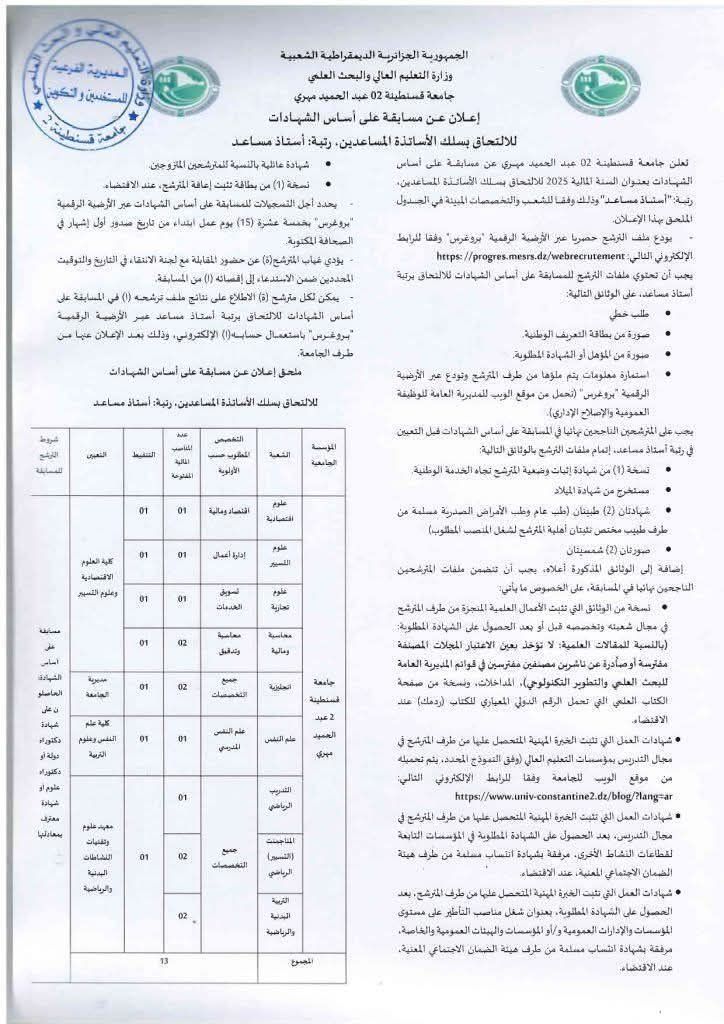 تعلن جامعة قسنطينة 02 عبد الحميد مهري عن مسابقة على أساس الشهادات بعنوان السنة المالية 2025 للالتحاق بسلك الأساتذة المساعدين، رتبة: “أستاذ مساعد” وذلك وفقا للشعب والتخصصات المبينة في الجدول الملحق بهذا الإعلان.
