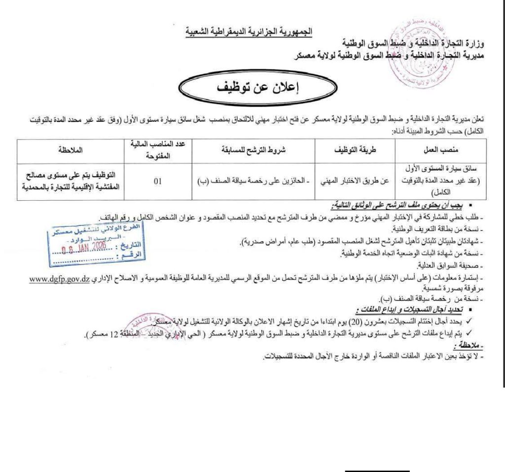 تعلن مديرية التجارة الداخلية وضبط السوق الوطنية لولاية معسكر عن فتح اختبار مهني للالتحاق بمنصب شغل سائق سيارة مستوى الأول (وفق عقد غير محدد المدة بالتوقيت الكامل) حسب الشروط المبينة أدناه: