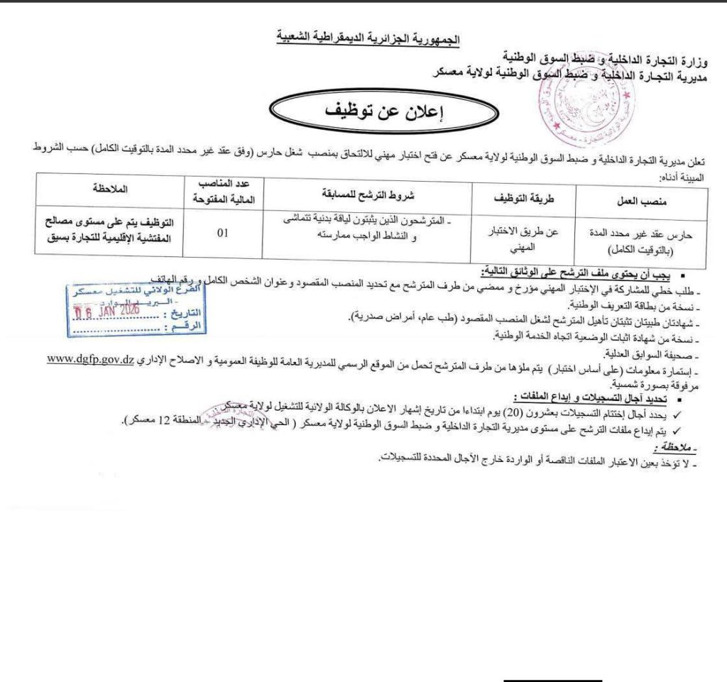 تعلن مديرية التجارة الداخلية وضبط السوق الوطنية لولاية معسكر عن فتح اختبار مهني للالتحاق بمنصب شغل حارس (وفق عقد غير محدد المدة بالتوقيت الكامل) حسب الشروط المبينة أدناه:
