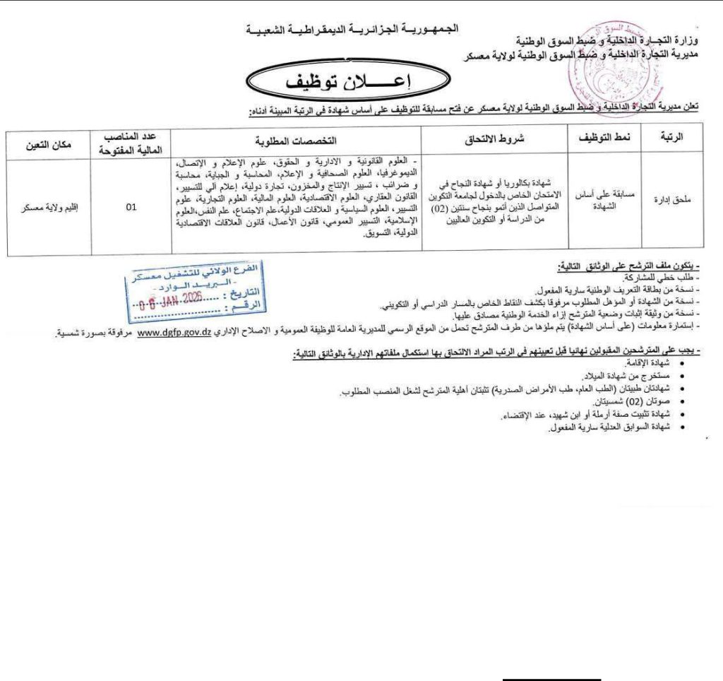 تعلن مديرية التجارة الداخلية وضبط السوق الوطنية لولاية معسكر عن فتح مسابقة للتوظيف على أساس الشهادة في الرتبة المبينة أدناه: