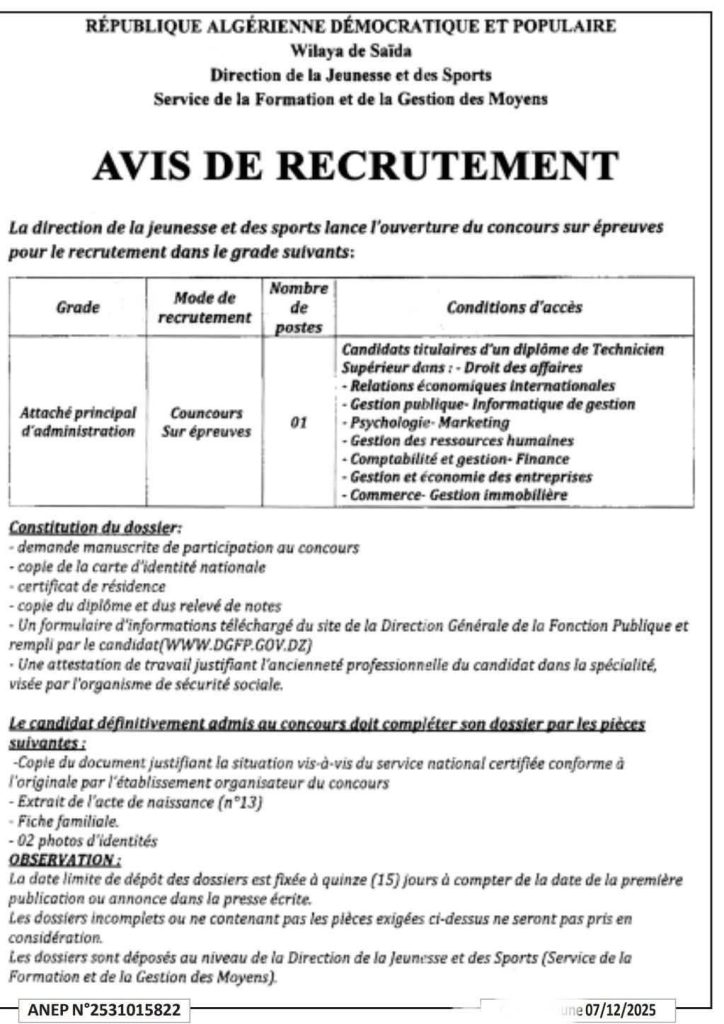 | ملحق رئيسي للإدارة | مسابقة على أساس الاختبارات | 01 | المترشحون الحائزون على شهادة تقني سامي في :– قانون الأعمال- العلاقات الاقتصادية الدولية- تسيير عمومي – إعلام آلي للتسيير- علم النفس – التسويق- تسيير الموارد البشرية- محاسبة وتسيير – مالية- تسيير واقتصاد المؤسسات- تجارة – تسيير عقاري |