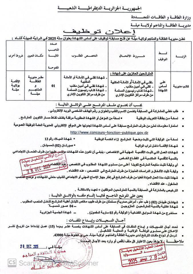 | كاتب مديرية | على أساس الشهادة | المترشحون الحائزون على: شهادة تقني في الأمانة أو الأمانة المكتبية، أو شهادة تقني في أمين مكتب، أو شهادة كتاب رئيسيون المسلمة من طرف مراكز التكوين الإداري. | 01 | مقر مديرية الطاقة والمناجم بميلة | الإقامة بولاية ميلة |