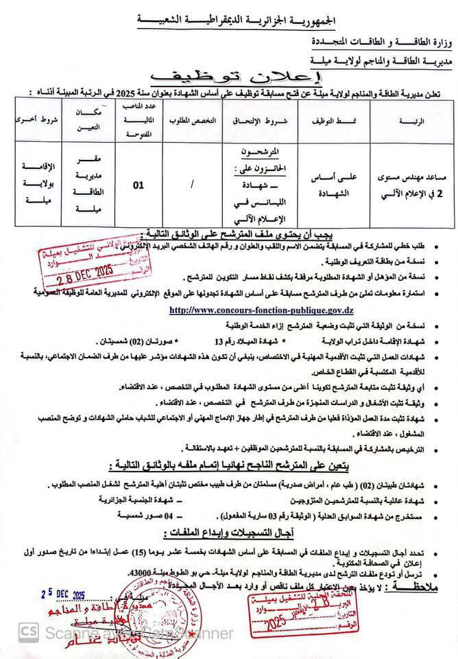 تعلن مديرية الطاقة والمناجم لولاية ميلة عن فتح مسابقة توظيف على أساس الشهادة بعنوان سنة 2025 في الرتب المبينة أدناه: