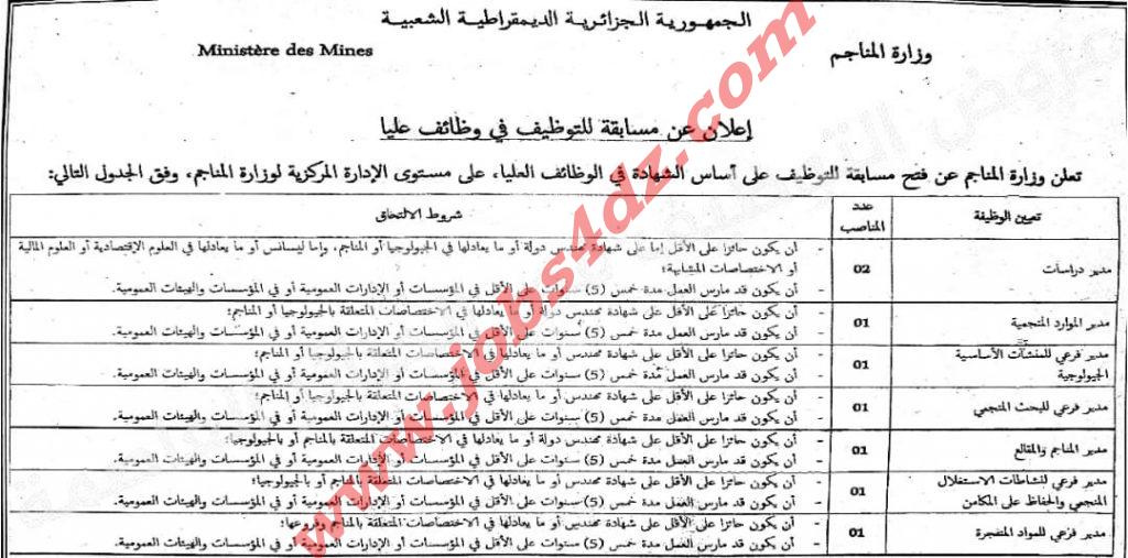 تعلن وزارة المناجم عن فتح مسابقة للتوظيف على اساس الشهادة في الوظائف العليا على مستوى الادارة المركزية لوزارة المناجم كما هو مبين ادناه