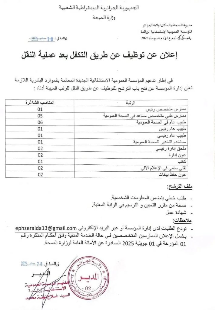 في إطار تدعيم المؤسسة العمومية الإستشفائية الجديدة المعالم بالموارد البشرية اللازمة تعلن إدارة المؤسسة عن فتح باب الترشيح للتوظيف عن طريق النقل للرتب المبينة أدناه: