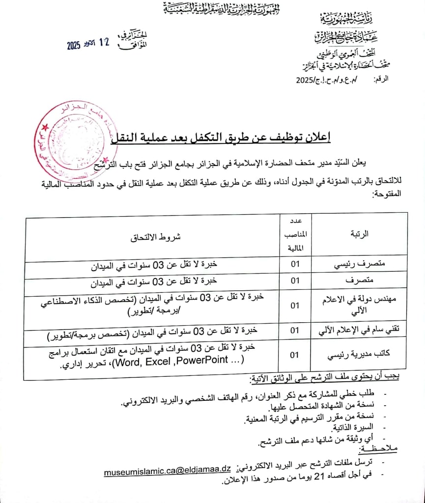 يعلن السيد مدير متحف الحضارة الإسلامية في الجزائر بجامع الجزائر فتح باب الترشح للالتحاق بالرتب المدونة في الجدول أدناه، وذلك عن طريق عملية التكفل بعد عملية النقل في حدود المناصب المالية المفتوحة: