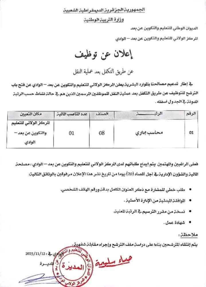 إعلان توظيف عن طريق التكفل بعد عملية النقل بالمركز الولائي للتعليم والتكوين عن بعد