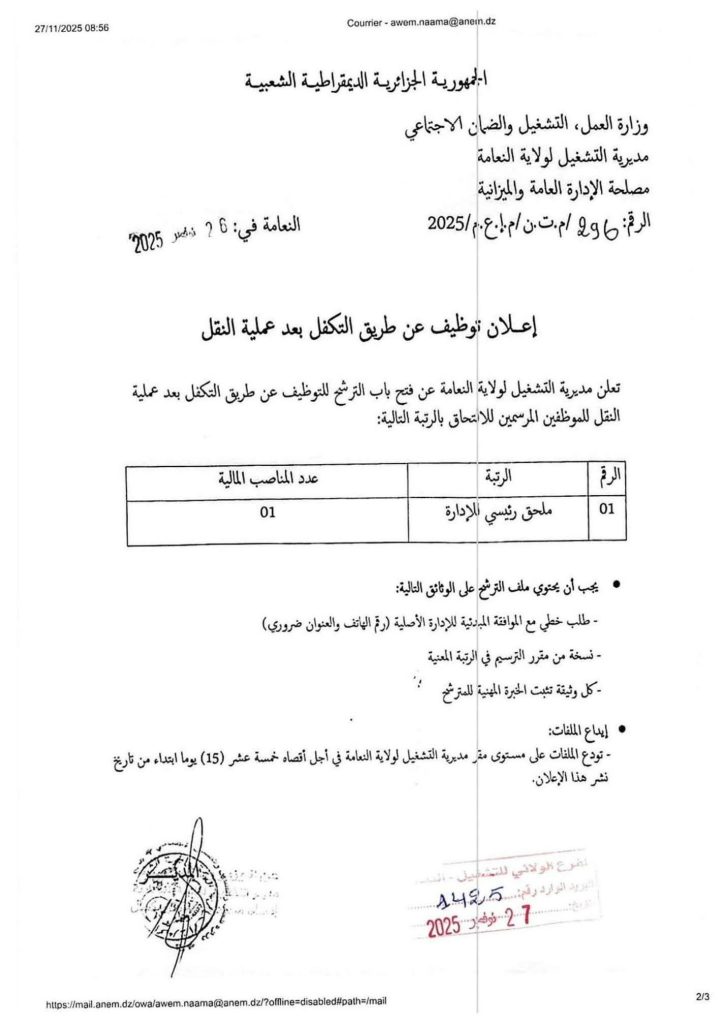 تعلن مديرية التشغيل لولاية النعامة عن فتح باب الترشح للتوظيف عن طريق التكفل بعد عملية النقل للموظفين المرسمين للالتحاق بالرتبة التالية: