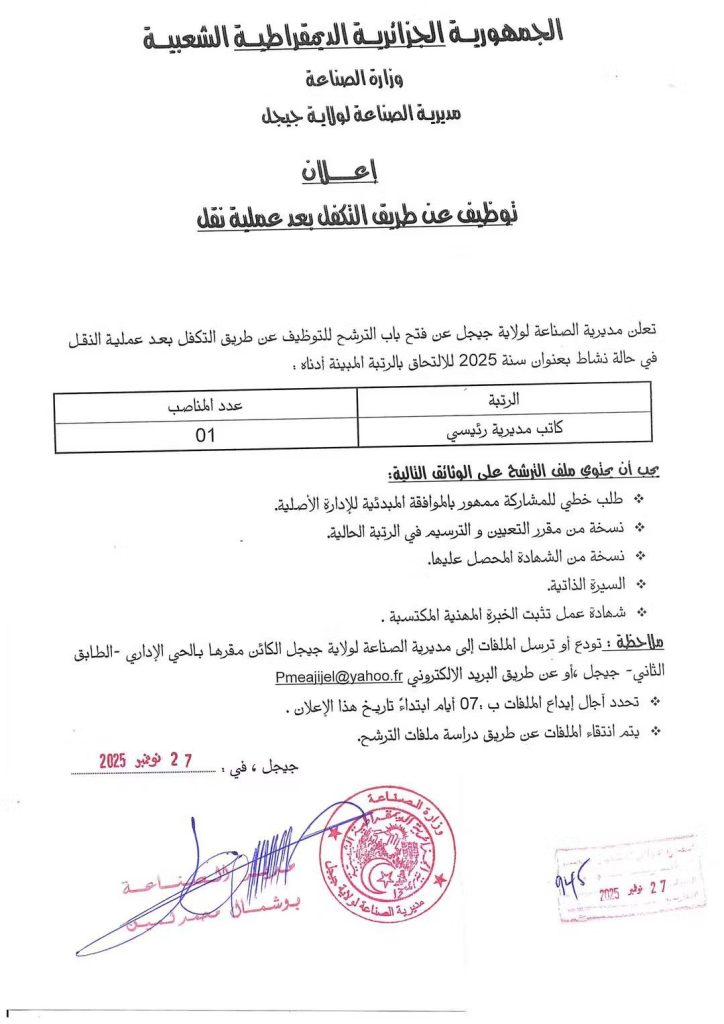 تعلن مديرية الصناعة لولاية جيجل عن فتح باب الترشيح للتوظيف عن طريق التكفل بعد عملية النقل في حالة نشاط بمنوان سنة 2025 للإلتحاق بالرتبة المبينة أدناه: