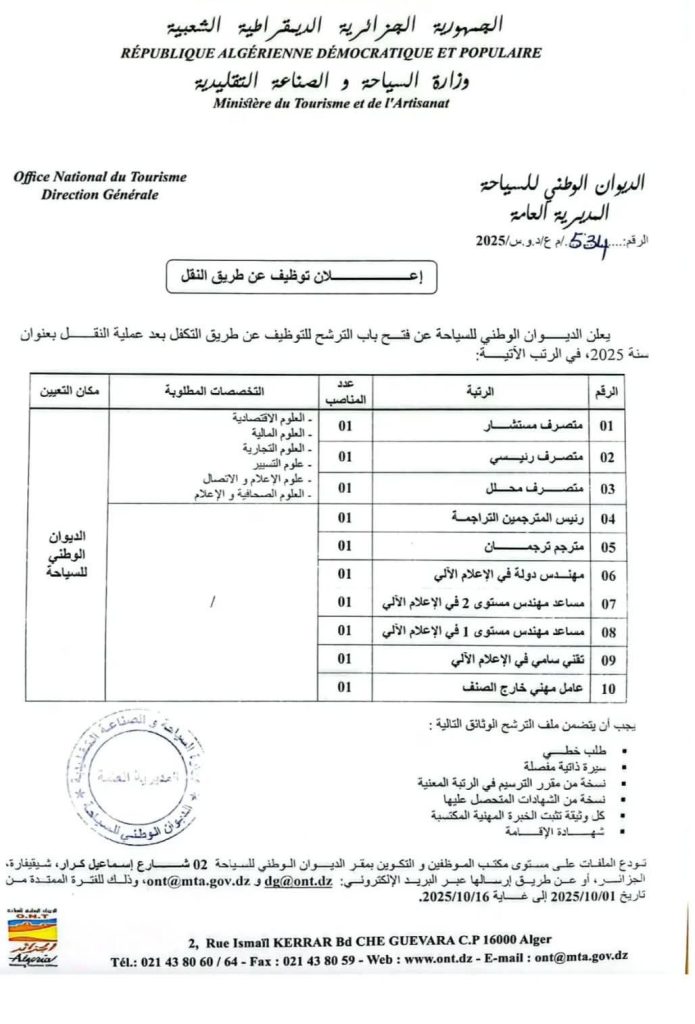 يعلن الديوان الوطني للسياحة عن فتح باب الترشح للتوظيف عن طريق التكفل بعد عملية النقل لمن يعلنون سنة 2025، في الرتب الآتية: