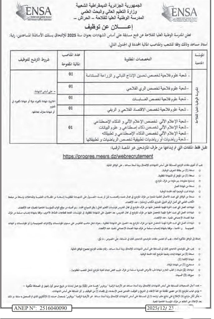 تعلن المدرسة الوطنية العليا للفلاحة عن فتح مسابقة على أساس الشهادات بعنوان سنة 2025 للالتحاق بسلك الأساتذة المساعدين، رتبة: أستاذ مساعد وذلك وفقا للشعب والمناصب المالية المحددة في الجدول التالي: