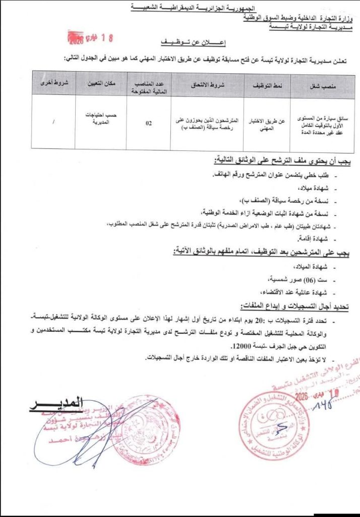 • تحدد فترة التسجيلات بـ 20 يوم ابتداء من تاريخ أول إشهار لهذا الإعلان على مستوى الوكالة الولائية للتشغيل – تبسة – والوكالة المحلية للتشغيل المختصة وتودع ملفات الترشح لدى مديرية التجارة لولاية تبسة مكتب المستخدمين والتكوين حي جبل الجرف – تبسة 12000.