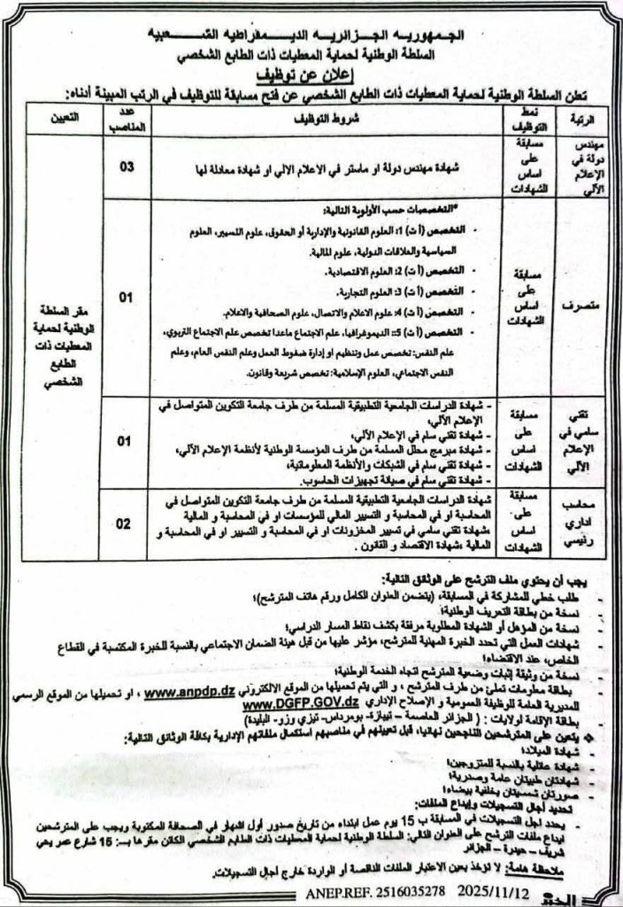- إعلان عن توظيف بالسلطة الوطنية لحماية المعطيات ذات الطابع الشخصي الجزائر البليدة تيبازة بومرداس تيزي وزو