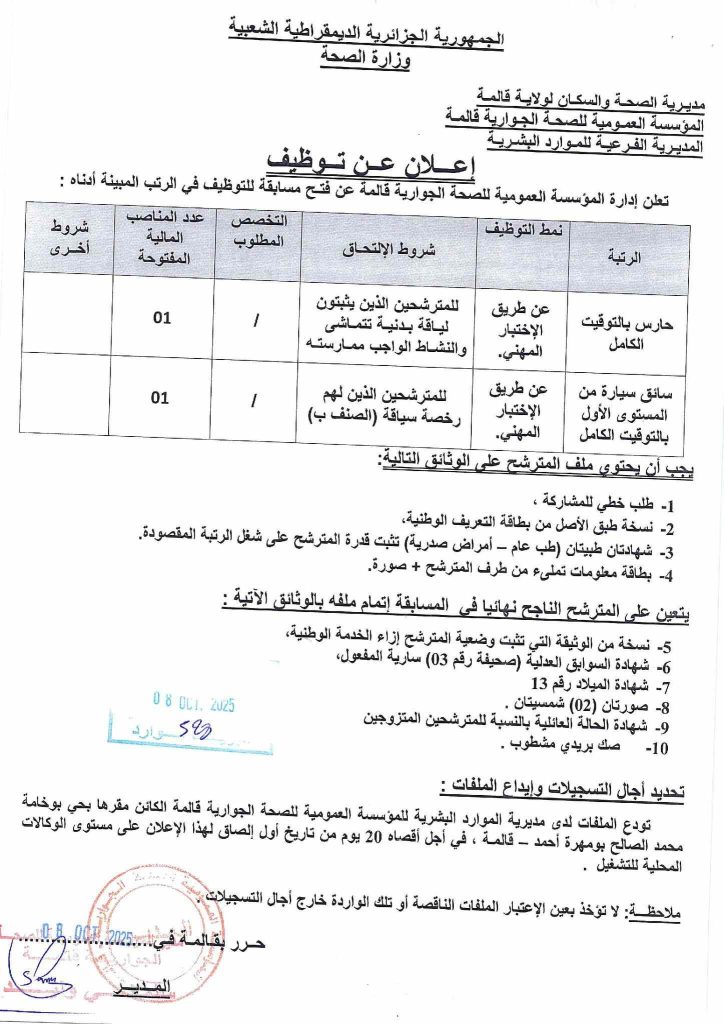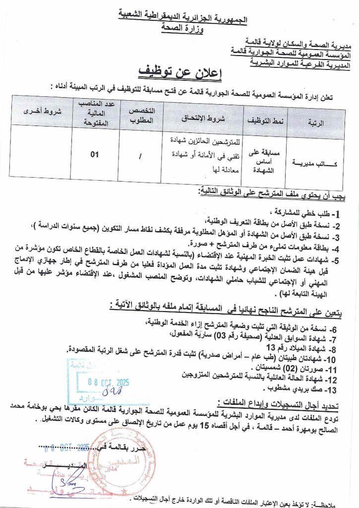 تعلن إدارة المؤسسة العمومية للصحة الجوارية قالمة عن فتح مسابقة للتوظيف في الرتب المبينة أدناه: