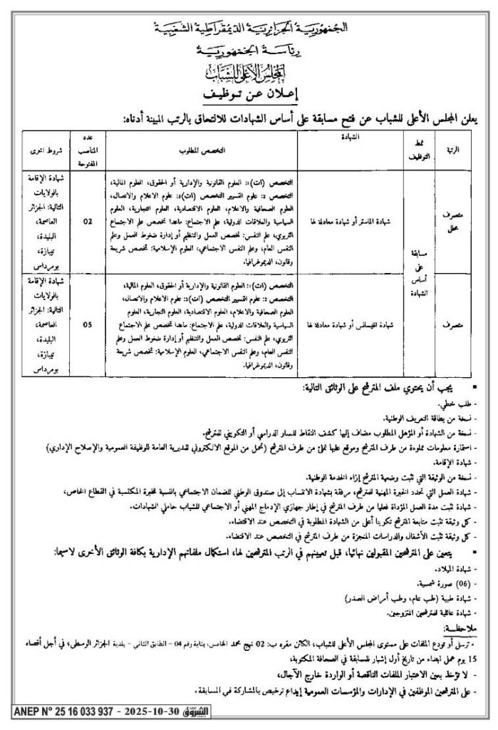 يعلن المجلس الأعلى للشباب عن فتح مسابقة على أساس الشهادات للإلتحاق بالرتب المبينة أدناه: