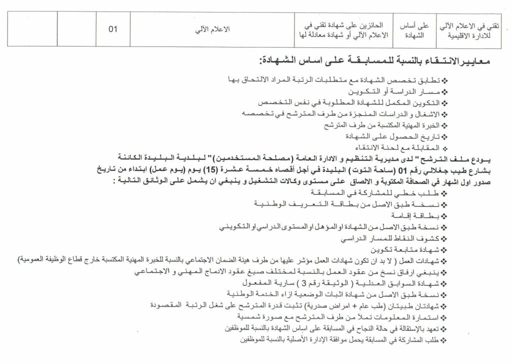 | تقني في الإعلام الآلي للإدارة الإقليمية | على أساس الشهادة | الحائزين على شهادة تقني في الإعلام الآلي أو شهادة معادلة لها | الإعلام الآلي | 01 | / | / |