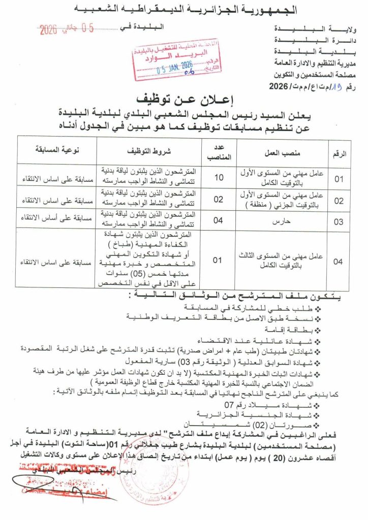 يعلن السيد رئيس المجلس الشعبي البلدي لبلدية البليدة عن تنظيم مسابقات توظيف كما هو مبين في الجدول أدناه: