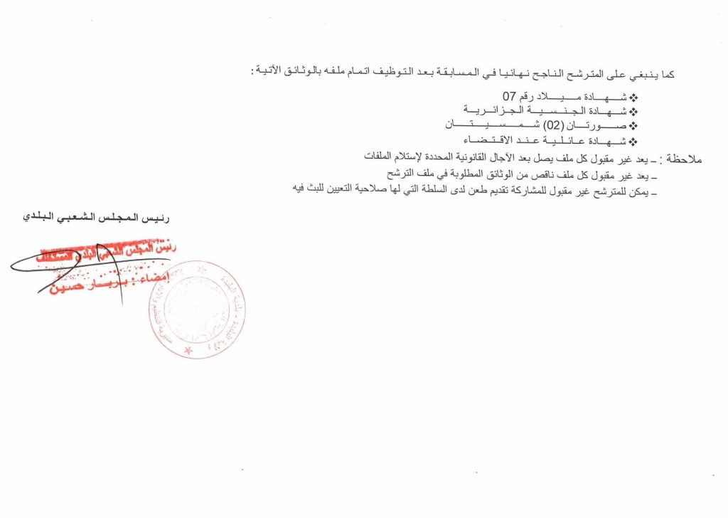 كما ينبغي على المترشح الناجح نهائيا في المسابقة بعد التوظيف اتمام ملفه بالوثائق الآتية: