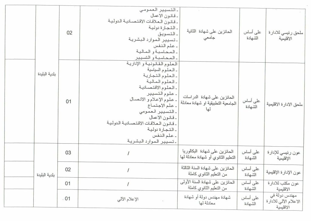 | ملحق رئيسي للإدارة الإقليمية | على أساس الشهادة | الحائزين على شهادة الثانية جامعي | – التسيير العمومي، قانون الأعمال، قانون العلاقات الاقتصادية الدولية، التجارة الدولية، التسويق، تسيير الموارد البشرية، علم النفس، المحاسبة والمالية، المحاسبة والتسيير. | 02 | بلدية البليدة | / |